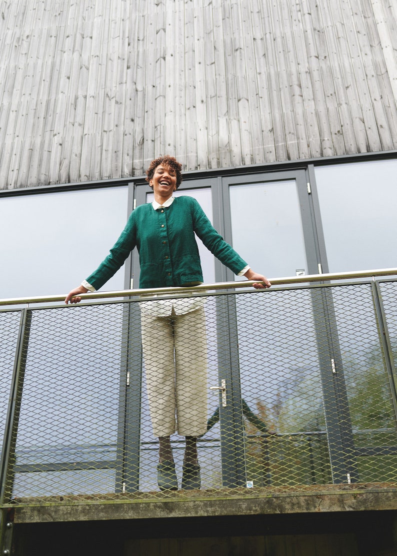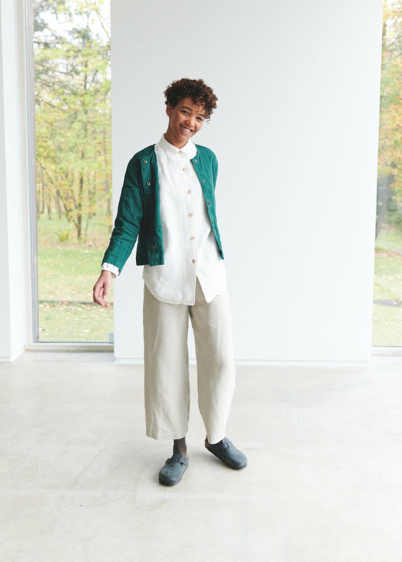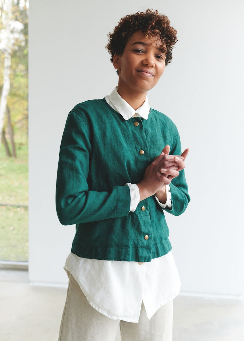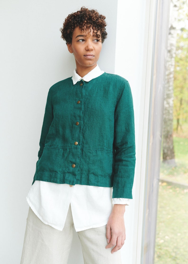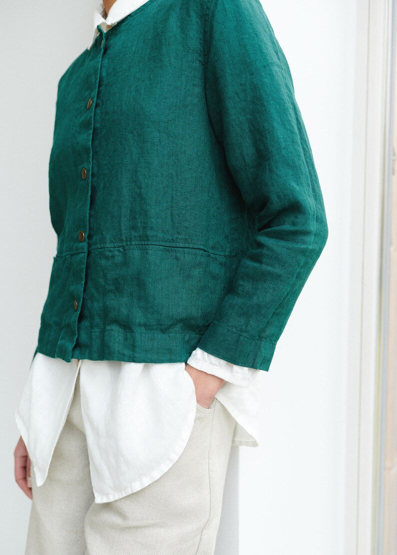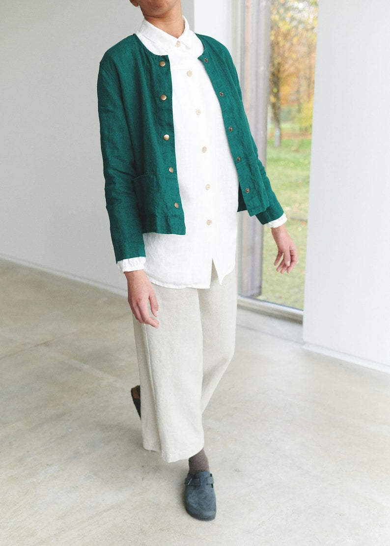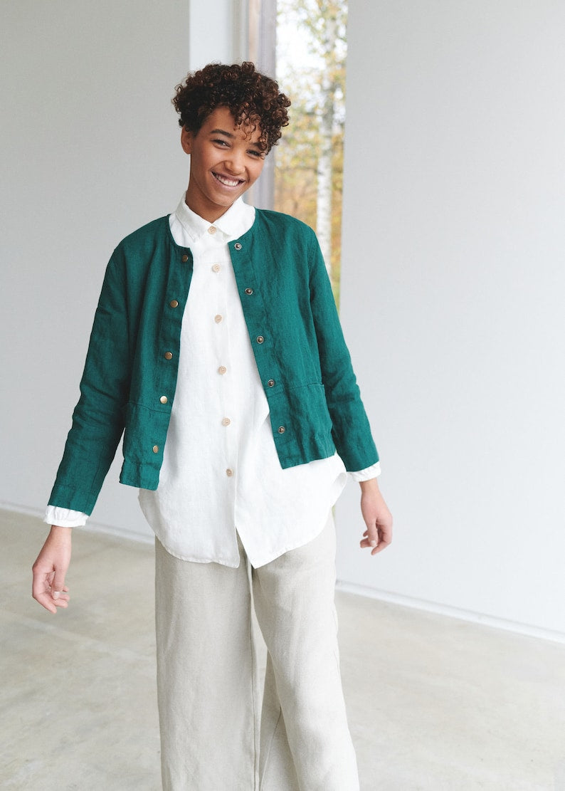 Diese Jacke aus strukturiertem Leinen besticht durch ihre gerade, minimalistische Silhouette und den modernen, kragenlosen Rundhalsausschnitt. Die durchgehende Knopfleiste mit matten Metallknöpfen und die feine Taillennaht sorgen für eine dezente Formgebung. Ein vielseitiges Layering-Piece für Übergangstage – elegant über Blusen oder locker über Basics tragbar.